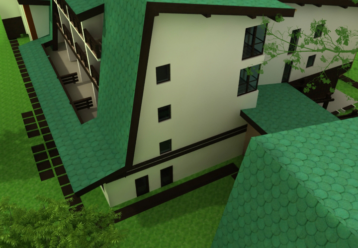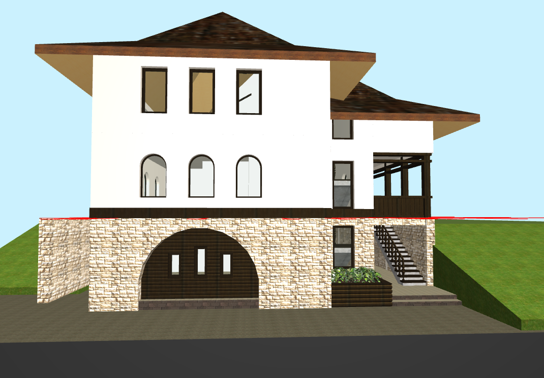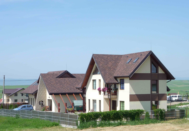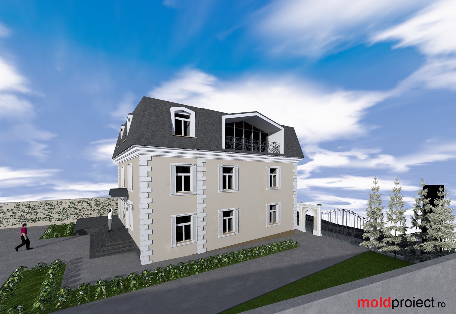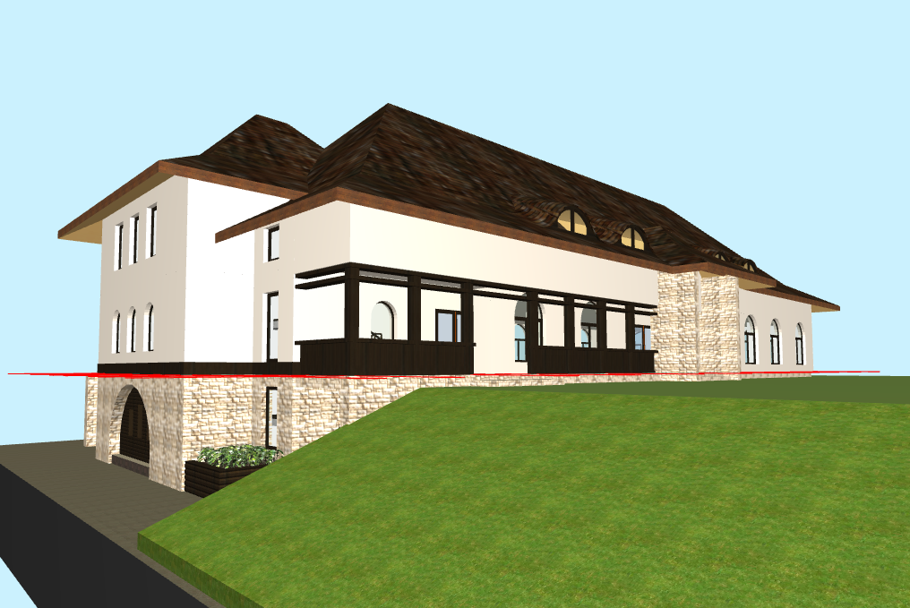 Astfel s-a impus o reducere drastica a suprafetei cerute de beneficiar initial si aducerea volumului arhitectural sub un acoperis masiv ce cobora in partea de la strada