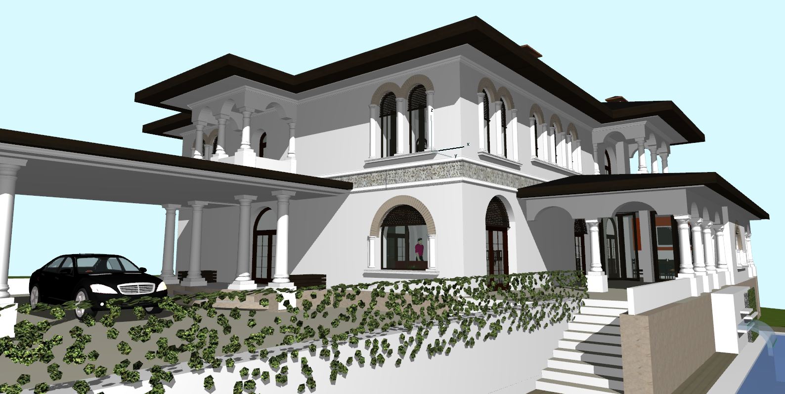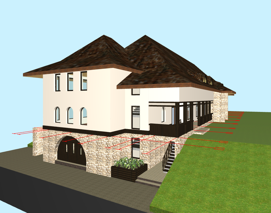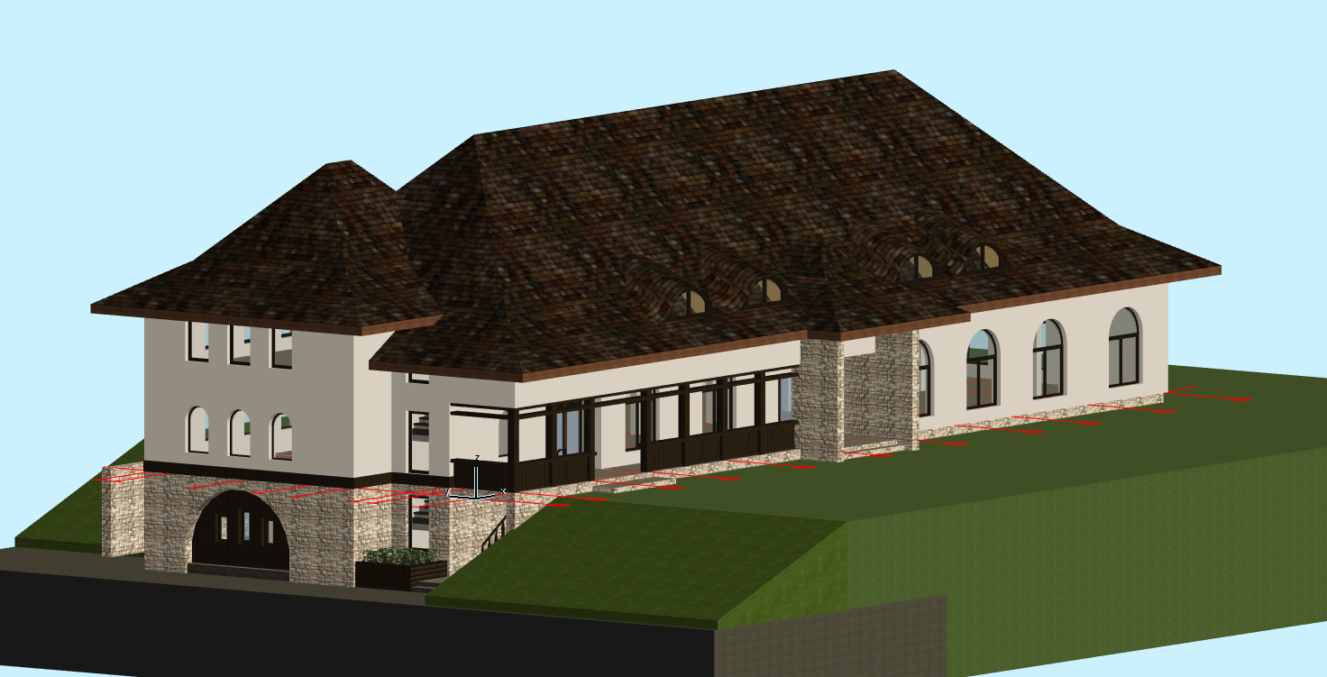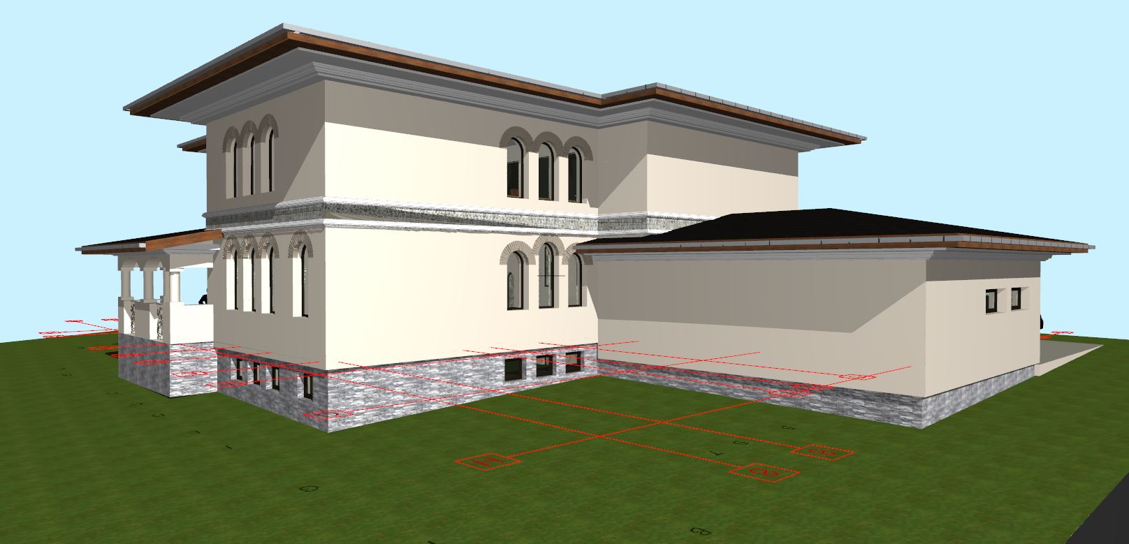 Astfel s-a impus o reducere drastica a suprafetei cerute de beneficiar initial si aducerea volumului arhitectural sub un acoperis masiv ce cobora in partea de la strada